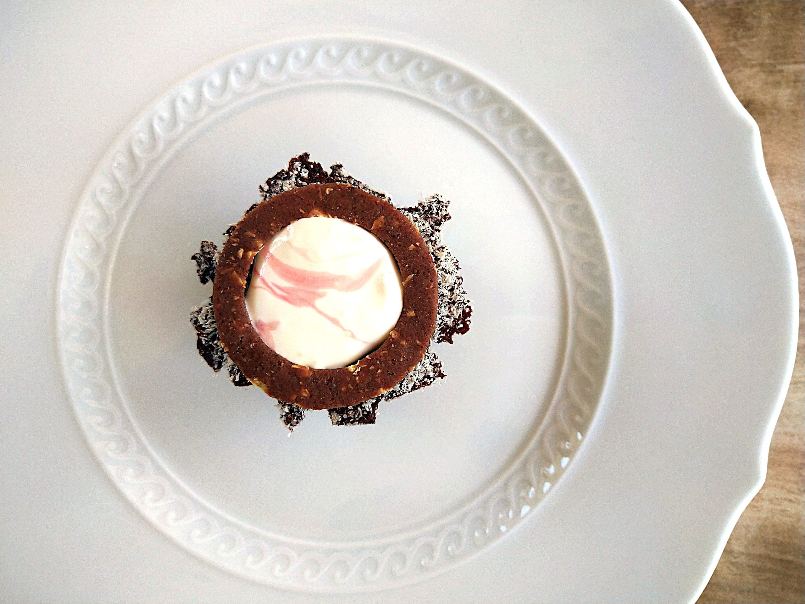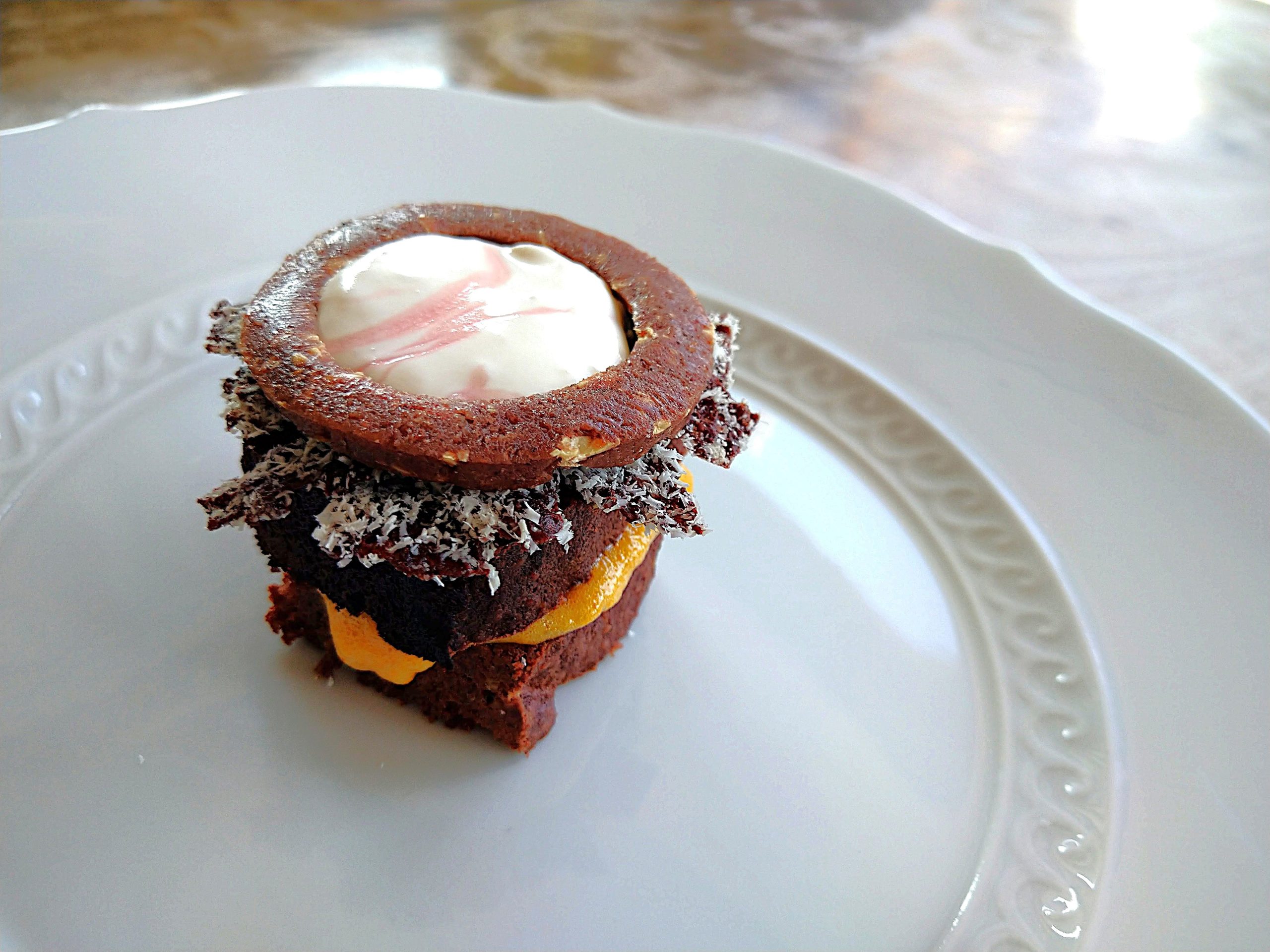 ボルゴ・コニシのトルタ・カプレーゼには、ザバイオーネクリーム、ローストしマルサラの香りをまとわせた**マカンボ**とチョコレートのバタークリームを添えて、アマレーナがほんのり香るホイップで軽やかに仕上げました。
